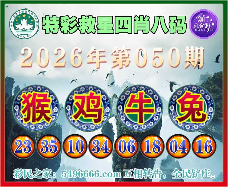 050期:《特彩救星》 🏅四肖八码🏅【鸡牛兔】开:猴23