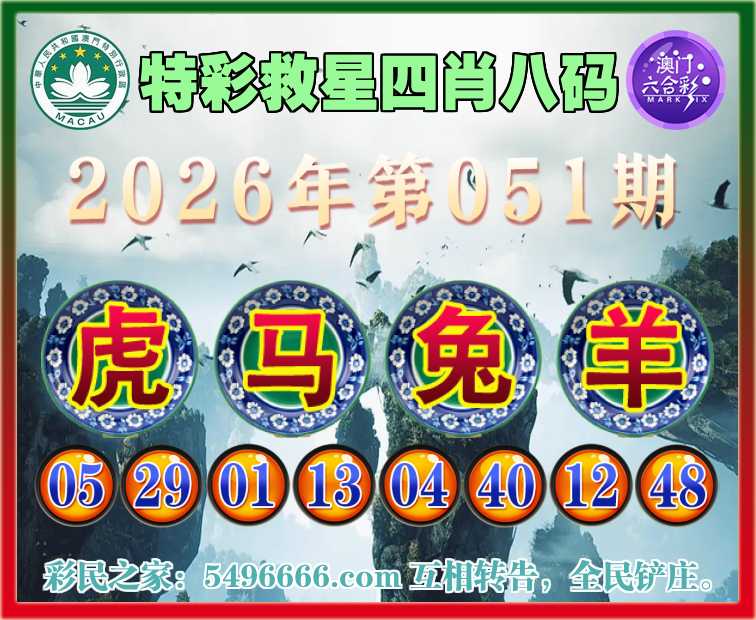 051期:《特彩救星》 🏅四肖八码🏅【虎兔羊】开:马01