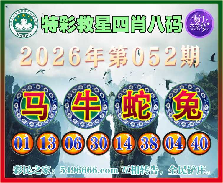 052期:《特彩救星》 🏅四肖八码🏅【马牛兔】开:蛇38