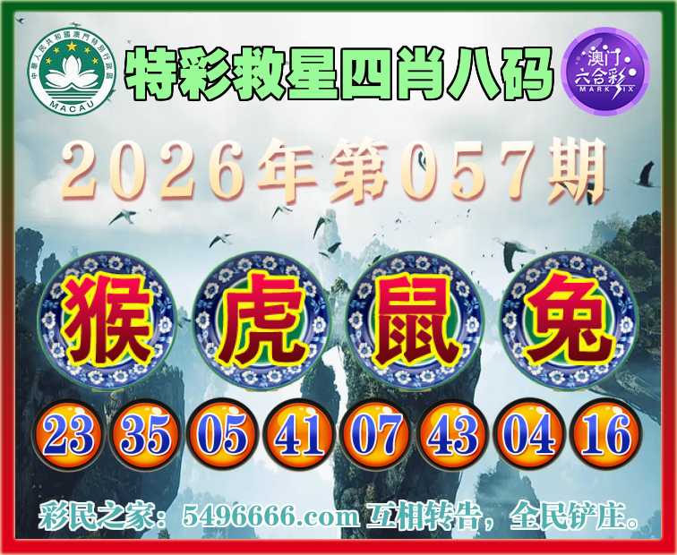 057期:《特彩救星》 🏅四肖八码🏅【虎鼠兔】开:猴23