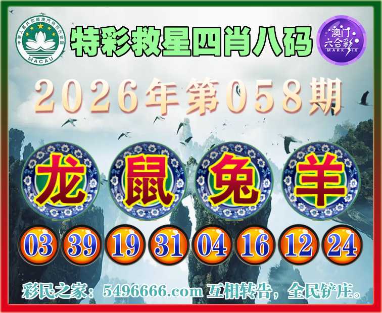 058期:《特彩救星》 🏅四肖八码🏅【龙兔羊】开:鼠31